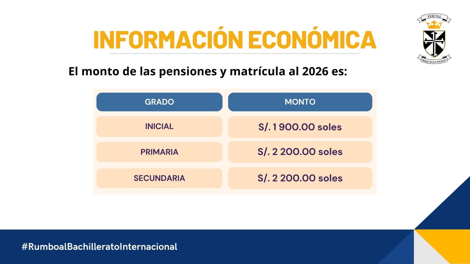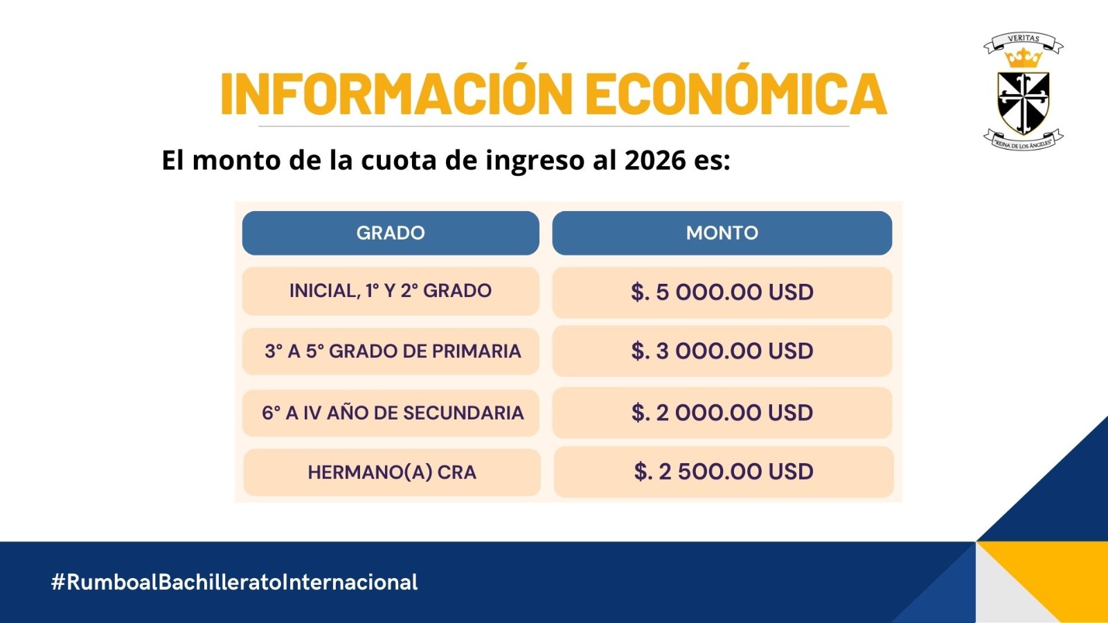 Cuadro de montos de la cuota de ingreso y pensión de enseñanza para el Año Escolar 2026.